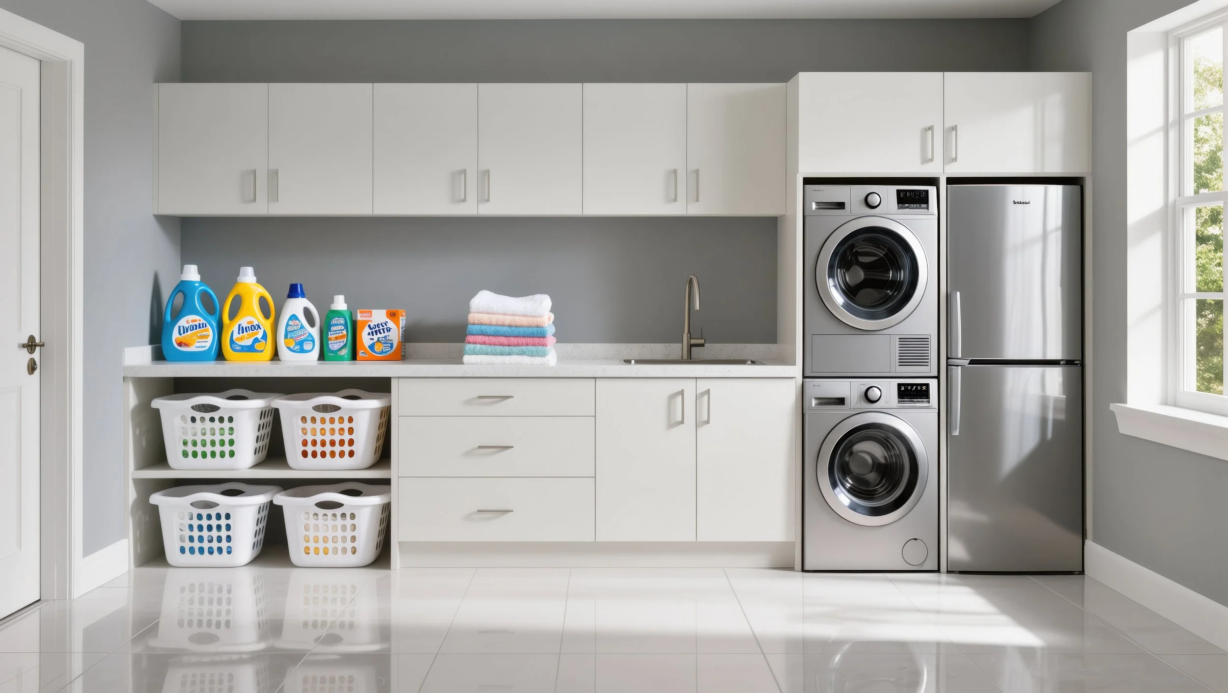 Practical cabinets with warranty water resistant solutions and storage areas for the laundry room.